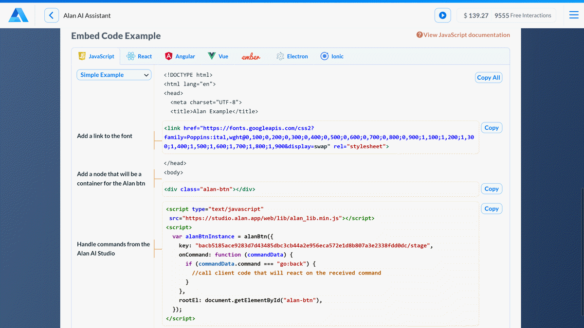 Next, we need to add the Agentic Interface to the website. Alan AI supports multiple web frameworks. In this tutorial, we will add to a webpage created with HTML and JavaScript.